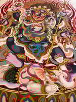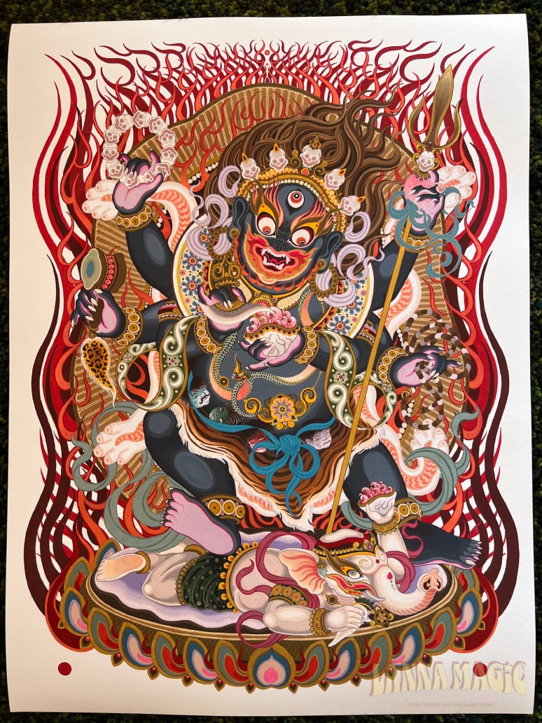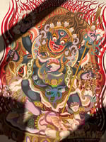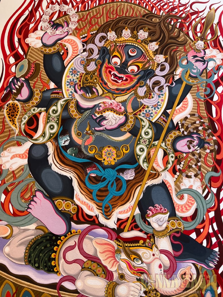 A prominent, fierce-looking protector deity in Tibetan Buddhism whose iconography represents the transcendence of obstacles and ignorance